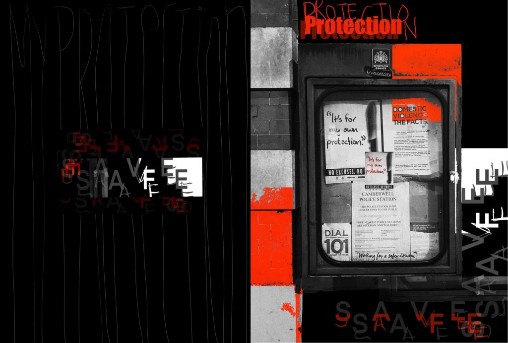 Protection – page 3 – this one is just a modern-day graphical layout with manipulation and repetition of typography and using the same color palette with a lot of red to emphasize the word protection.