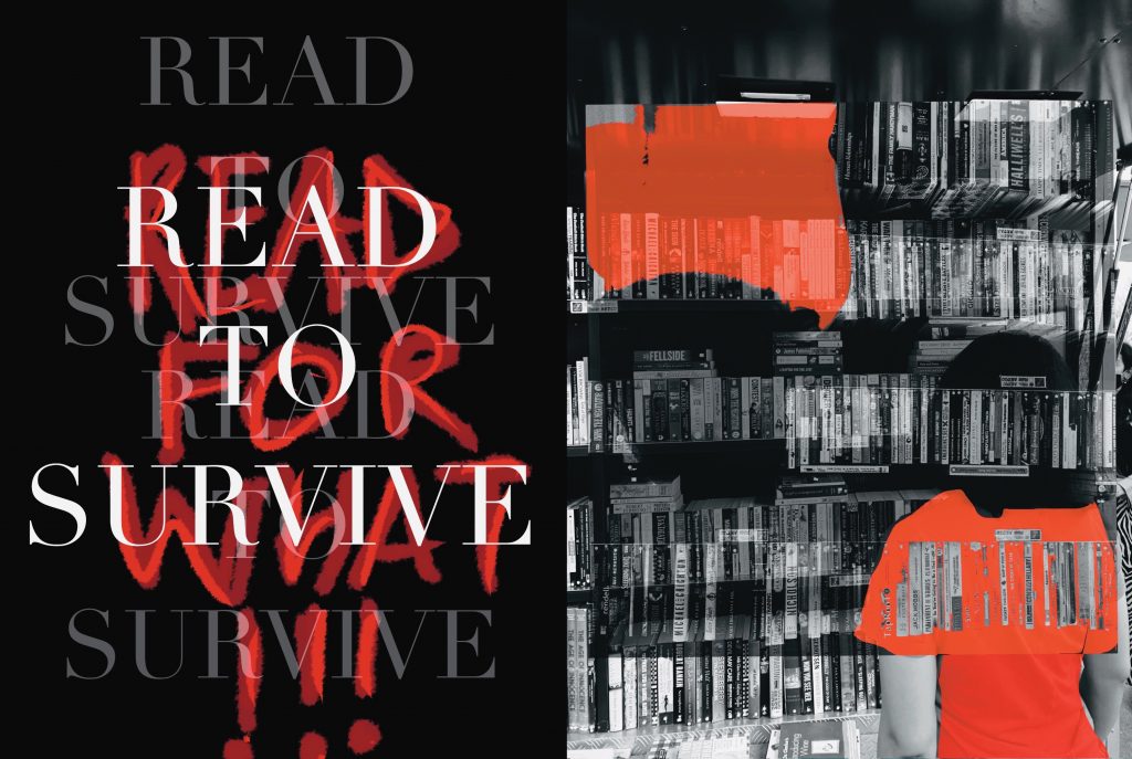 Survive – page 1 – the first artwork follows the monochromatic in the word colour scheme unanswered tells us the importance to read which is to survive in the freehand text it also comments ‘read for what ‘. the use of a traditional font along with handwritten text and the showcasing of books, one of the oldest known things to earth along with the modern-day editing is what shows the contrast.