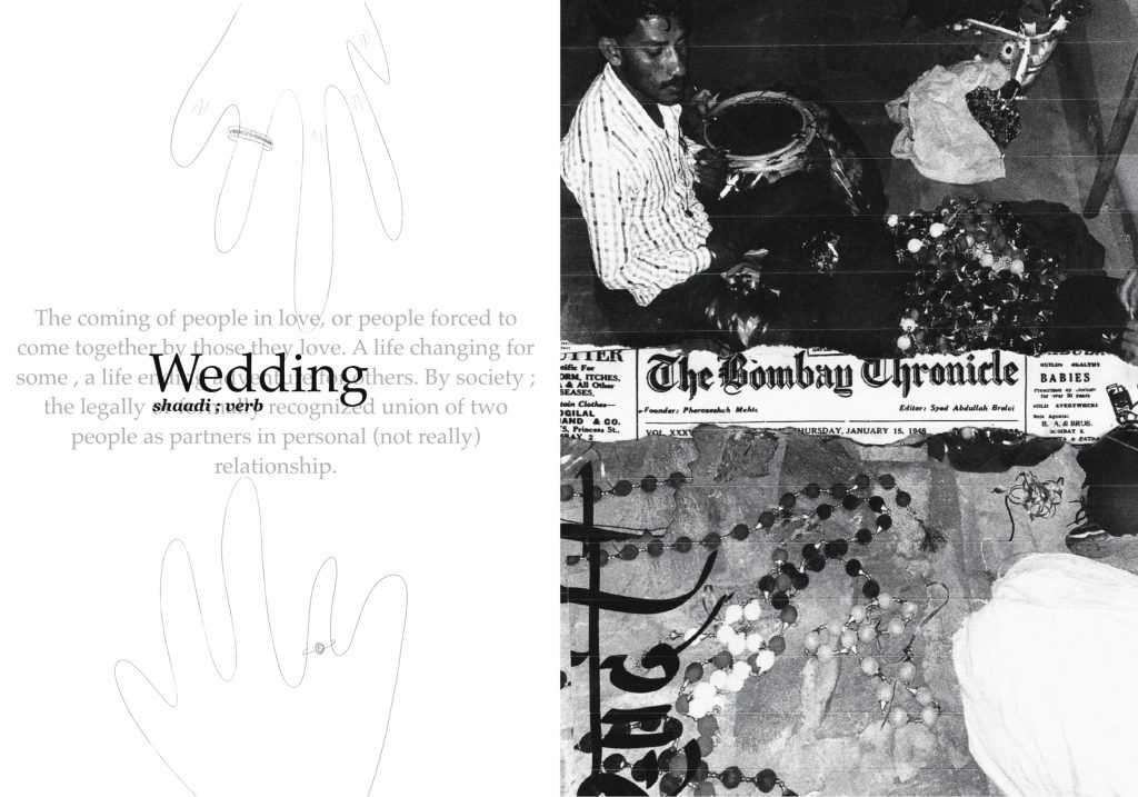 Wedding – page 2 – this peace shows the modern they were in traditions with a 1947 news Bombay newspaper in the background. Again with the text, it is and all traditional text but the meaning of the word is something completely modern, and even the hand-drawn fixtures at the back breakthrough the entire composition of the artwork.