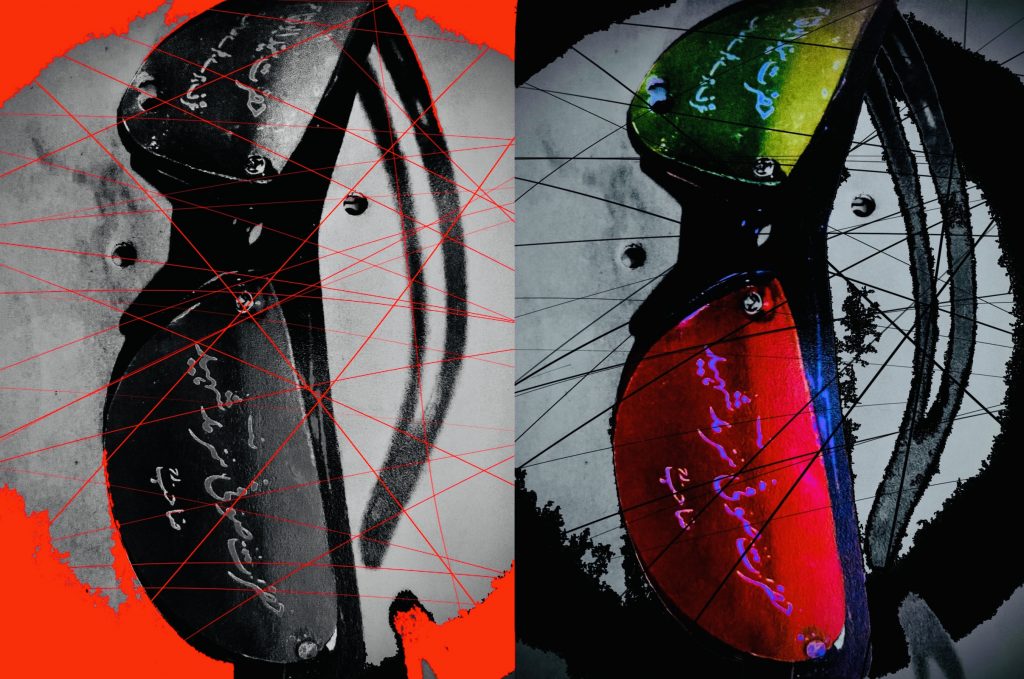 Sights – page 5 – this is the same image being shown in a black and white format and colorful format. The red and black strings show how culture and religion can be changed, deferred, and completely rationalized, They show the misunderstanding of wrong connections and the wrong views we make through our eyes just because of our beliefs or believes that we have been forced to believe