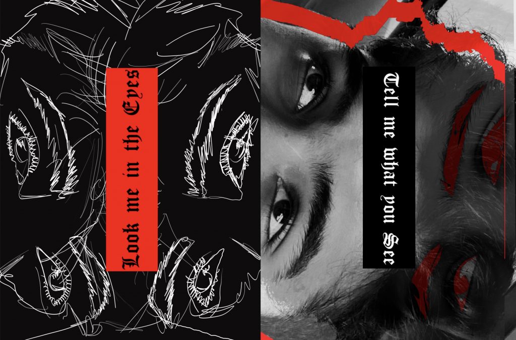 Eyes – page 8 – this is a completely modern-day edit, with the use of all Roman English font – that is the contrast. Otherwise, the bold use of red in both the images and the hand drawing along with Photoshop editing makes it a truly modern-day graphic design edit.