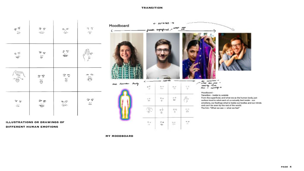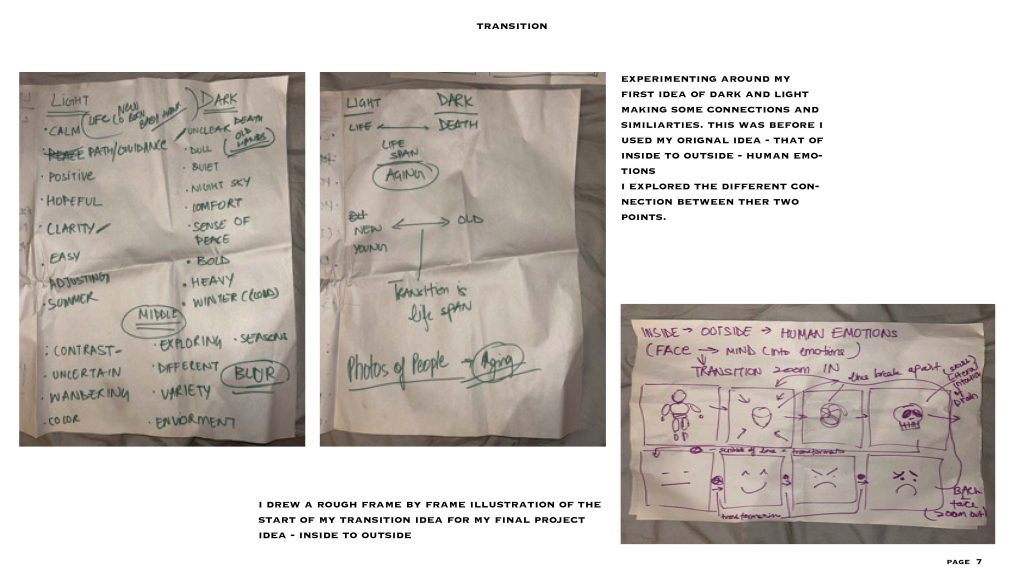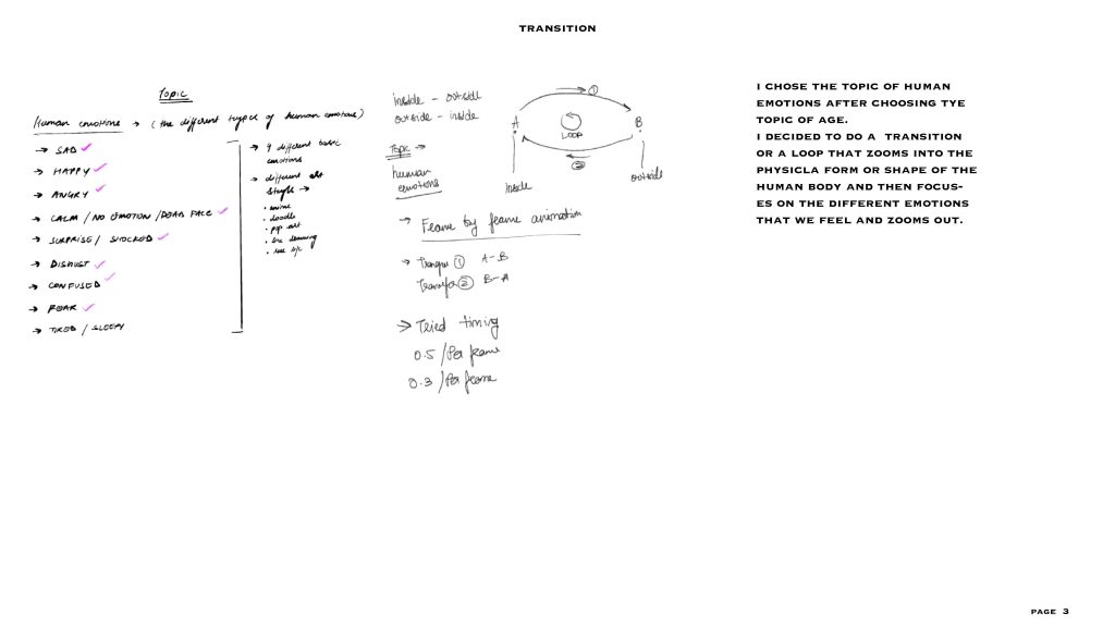 this is my final outcome of the transition project – my topic here was human emotions and the animation i drew also shows the connection between the moving images and the sound i have used. the sound in the back is my roomates talking and the different moving images are the different emotions we experience as humans.