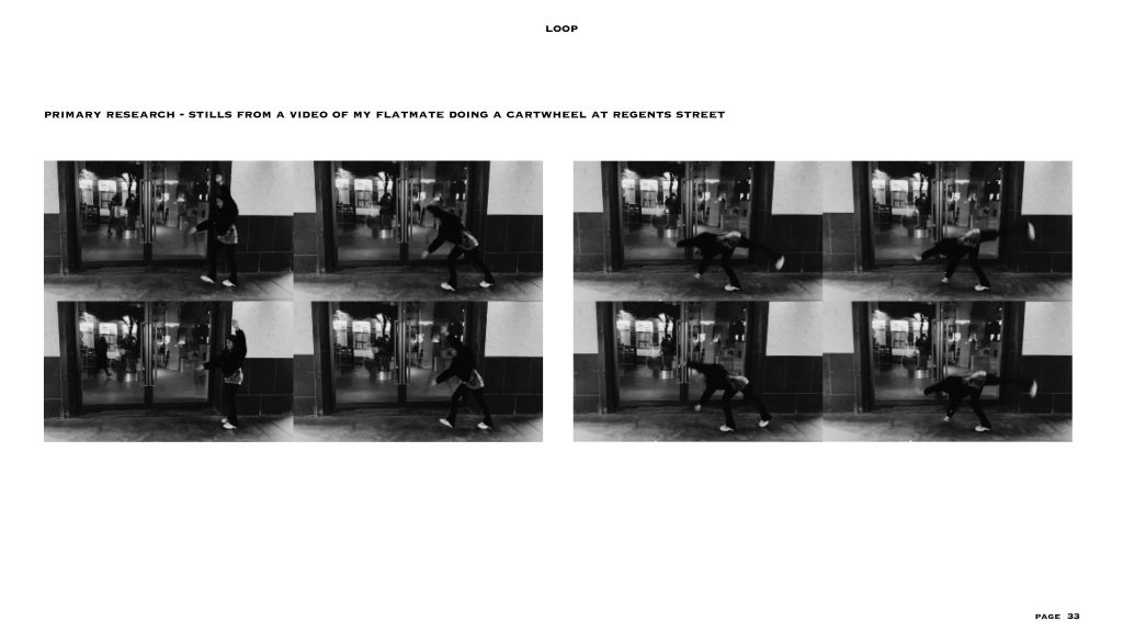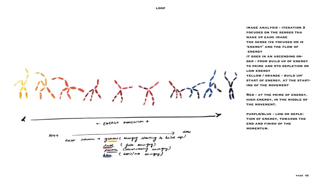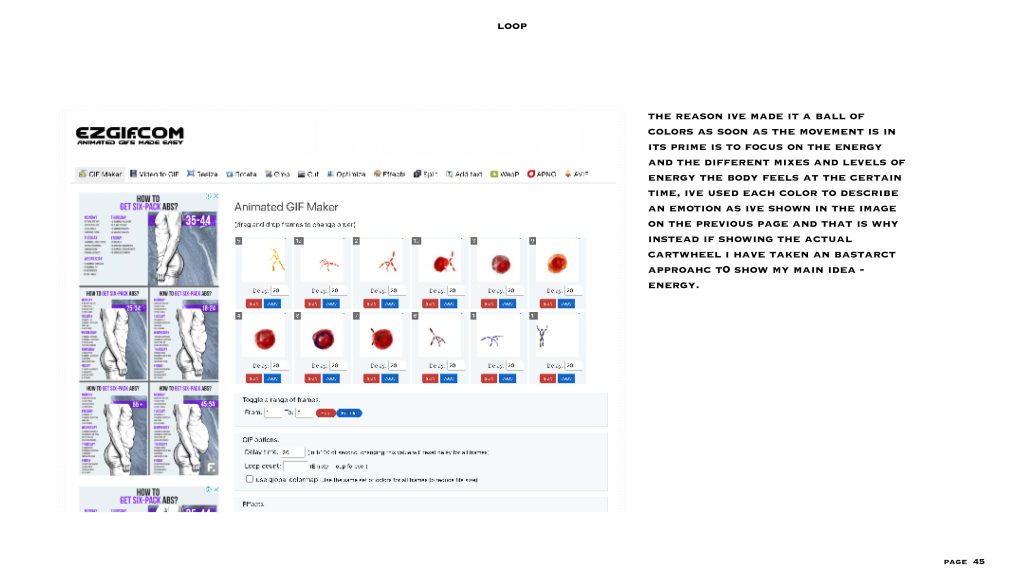 in this project, I looked at the relationship between image production, manipulation, composition and the field of graphic and media design. the aim was to create a sequence after choosing a figure in motion. the motion i chose was my friend doing a cartwheel and related that with body energy levels and used a different colours to show visual representations of that.