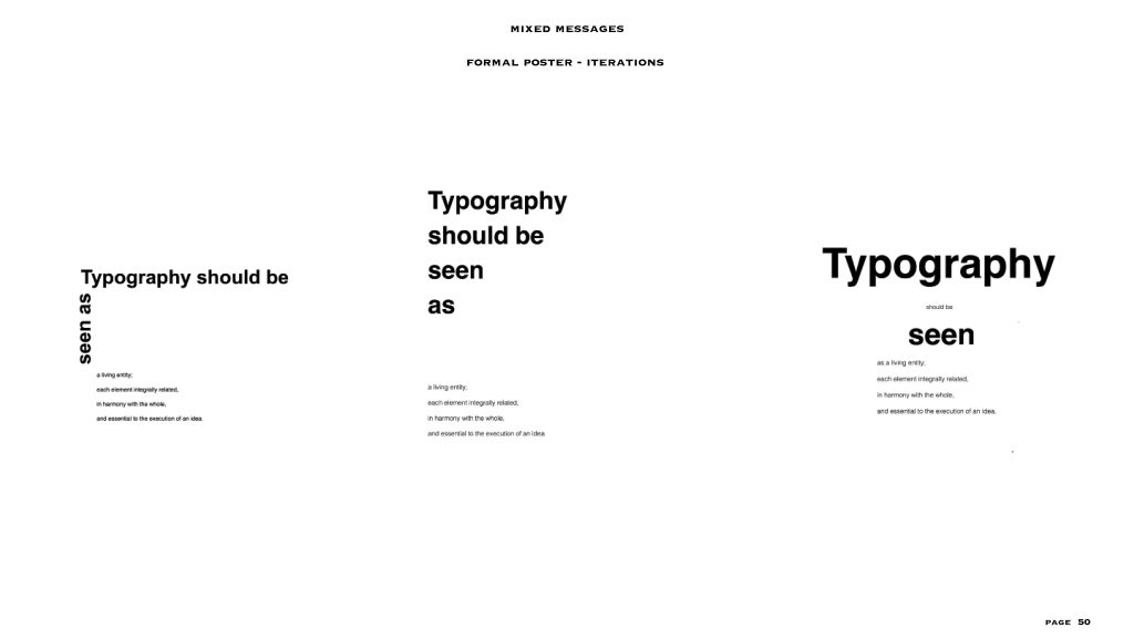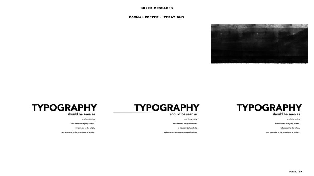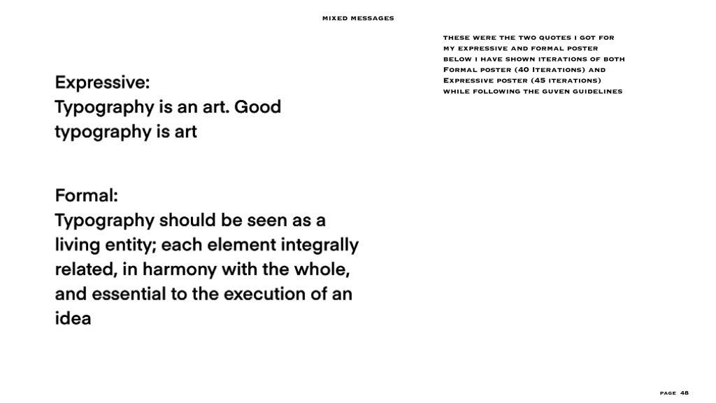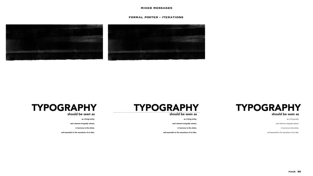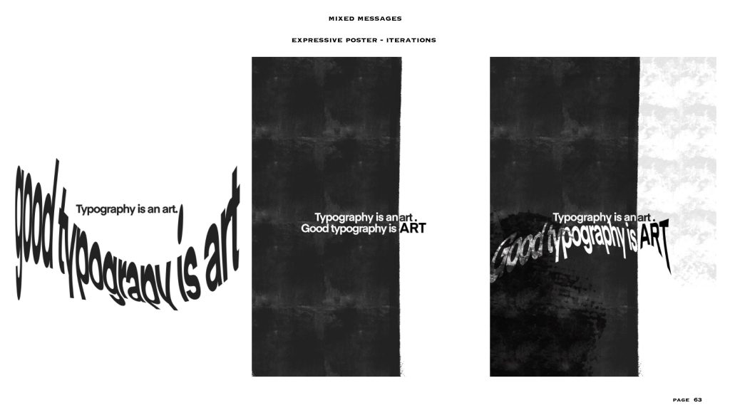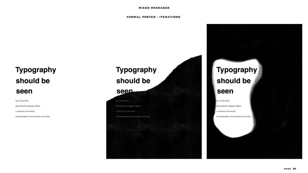 this project gave me the freedom to a level, the text and the colour scheme (black and white) were already given to us. I had to make two posters – one expressive and one formal, in my visual summary you can see there are at least 40/45 iterations for each style of poster. I personally love to create posters or any editorial designs and illustrations, so I could really experiment with this project. even though the lines for experimentation were a bit constrained I was able to explore a lot within the few things given and I feel like that made me really understand the concept of typography, colour balance and placement. i added layers to each project especially the expressive poster through means of composition, treatments, affectations, manipulation processes and much more.